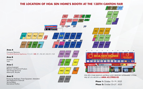 Hoa Sen Home 将于 2025年10月15日至19日(第一阶段)及10月23日至27日(第二阶段)在 A2.2TRSS-05 展区设立展位。诚挚邀请全球各地的合作伙伴、生产商和贸易商莅临参观展位,交流洽谈合作机会。