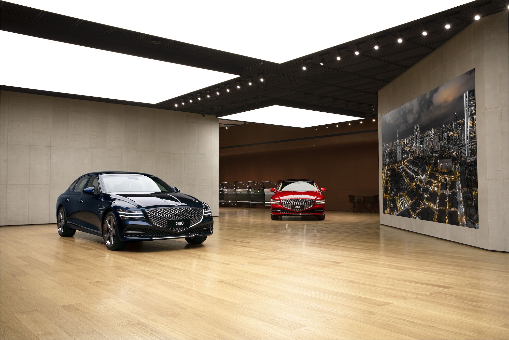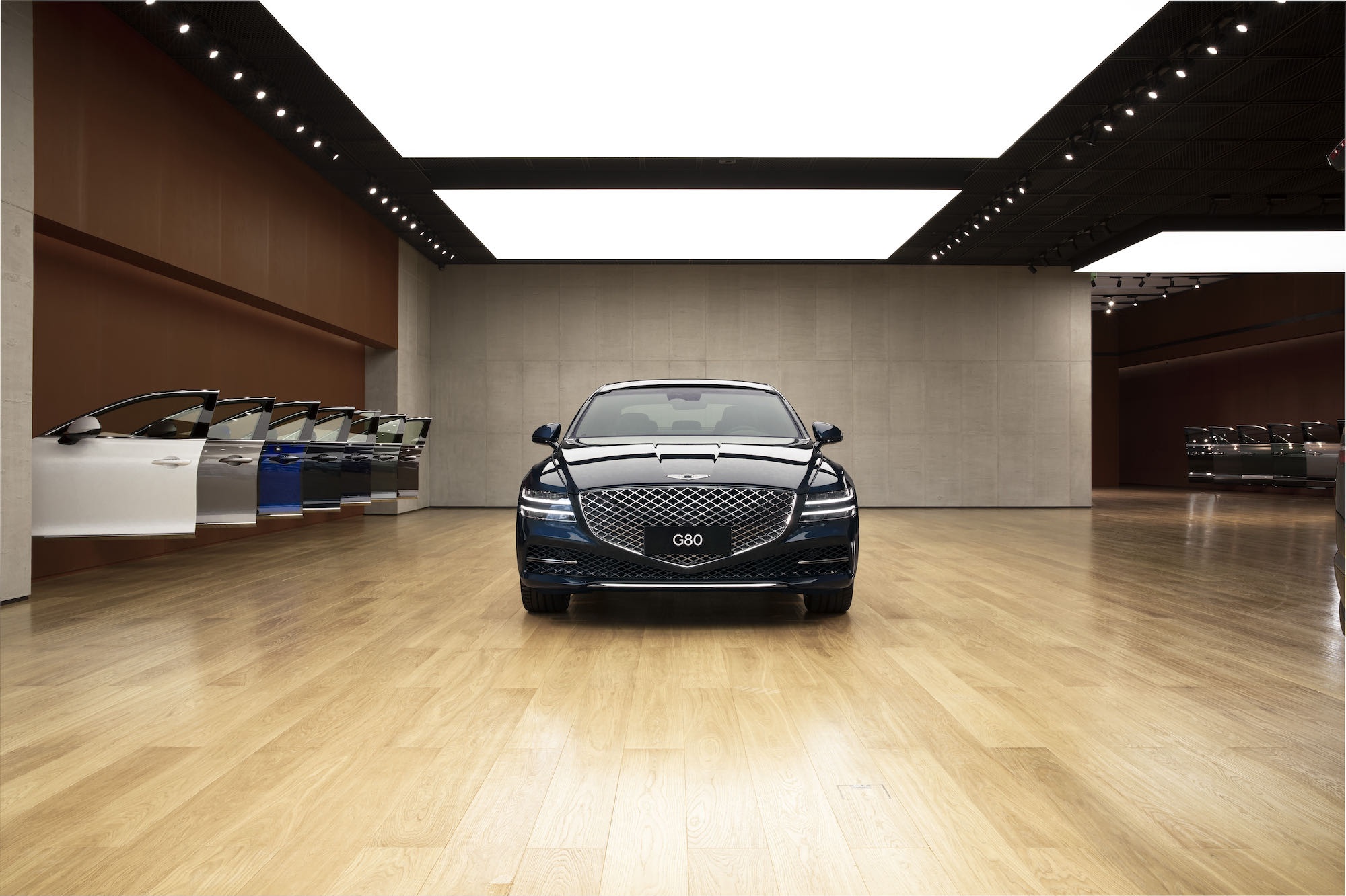 捷尼赛思车型陈列于多维镜前,消费者可以从不同角度观察车型。“车门之翼”则将多种颜色组合的车门排列展示,供消费者随心地触摸、开合,感受不同色彩组合的搭配巧思。自然光线透过屋顶的观景天窗倾泻于捷尼赛思车型上,与室内绿植景观相得益彰,营造出明亮而开阔的绿色空间。自然的光源映射出捷尼赛思车型最纯粹的色泽,充分地还原了其本真之美。