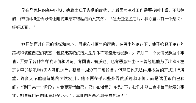 分手之后的马思纯也由于各种各样的原因而长胖了不少,这也让她遭受到了强大的网络暴力。近日她在登上某时尚杂志封面时,她也再次解释了自己发胖的原因,是用药物治疗自己的情绪,一开始也因此而困扰,但是如今也明白了如果连自己的健康都保证不了,其他的东西不都是虚的吗?