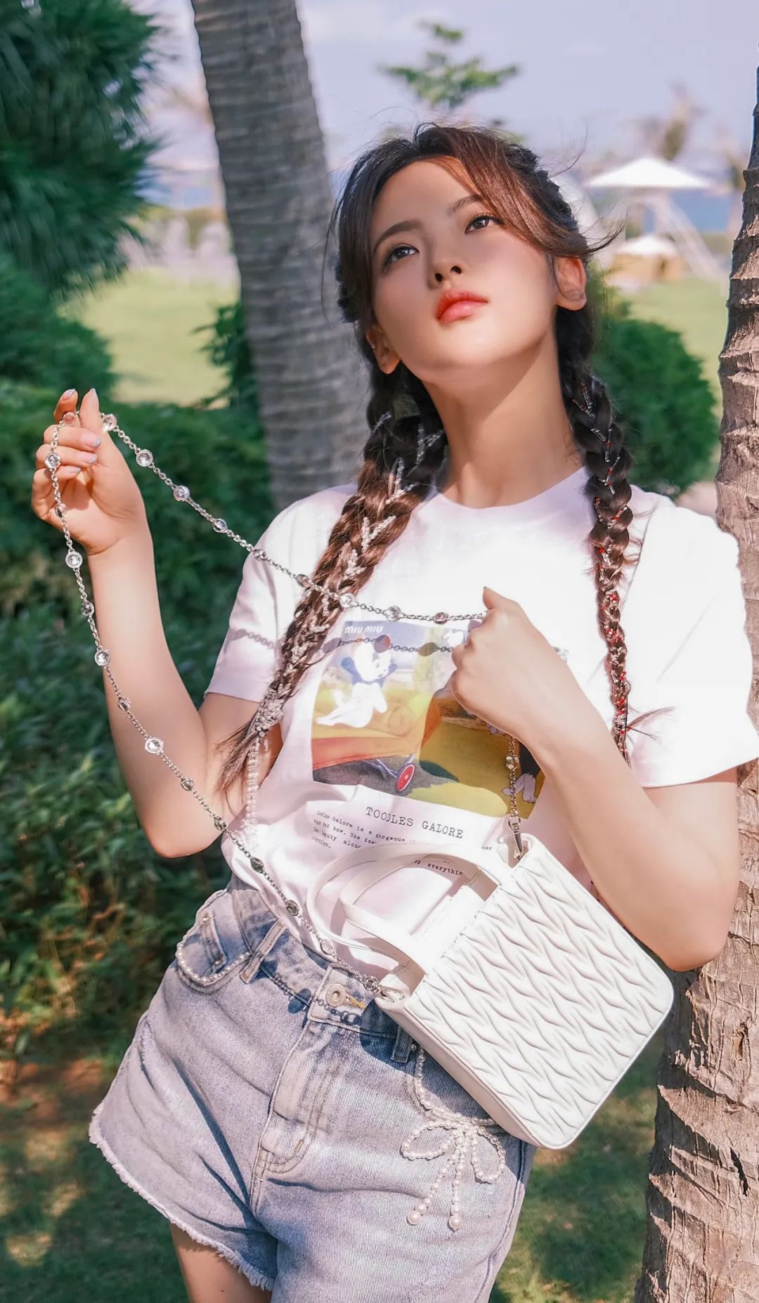 另一款带有经典元素的手袋被设计成小购物袋的款式,链条上镶有钻饰装饰,杨超越、周也等一票甜妹都背了,裙装裤装都能与它匹配。